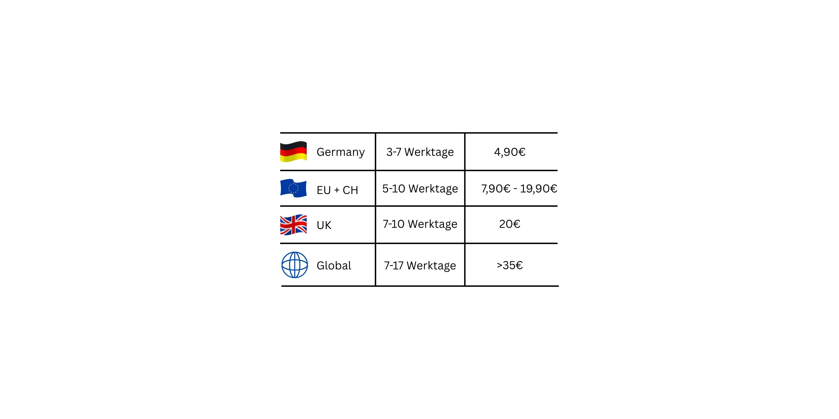 Alle Versandarten und Preise haben wir dir unten übersichtlich zusammengefasst. Wenn du Fragen dazu hast, schreib uns jederzeit - wir kümmern uns.